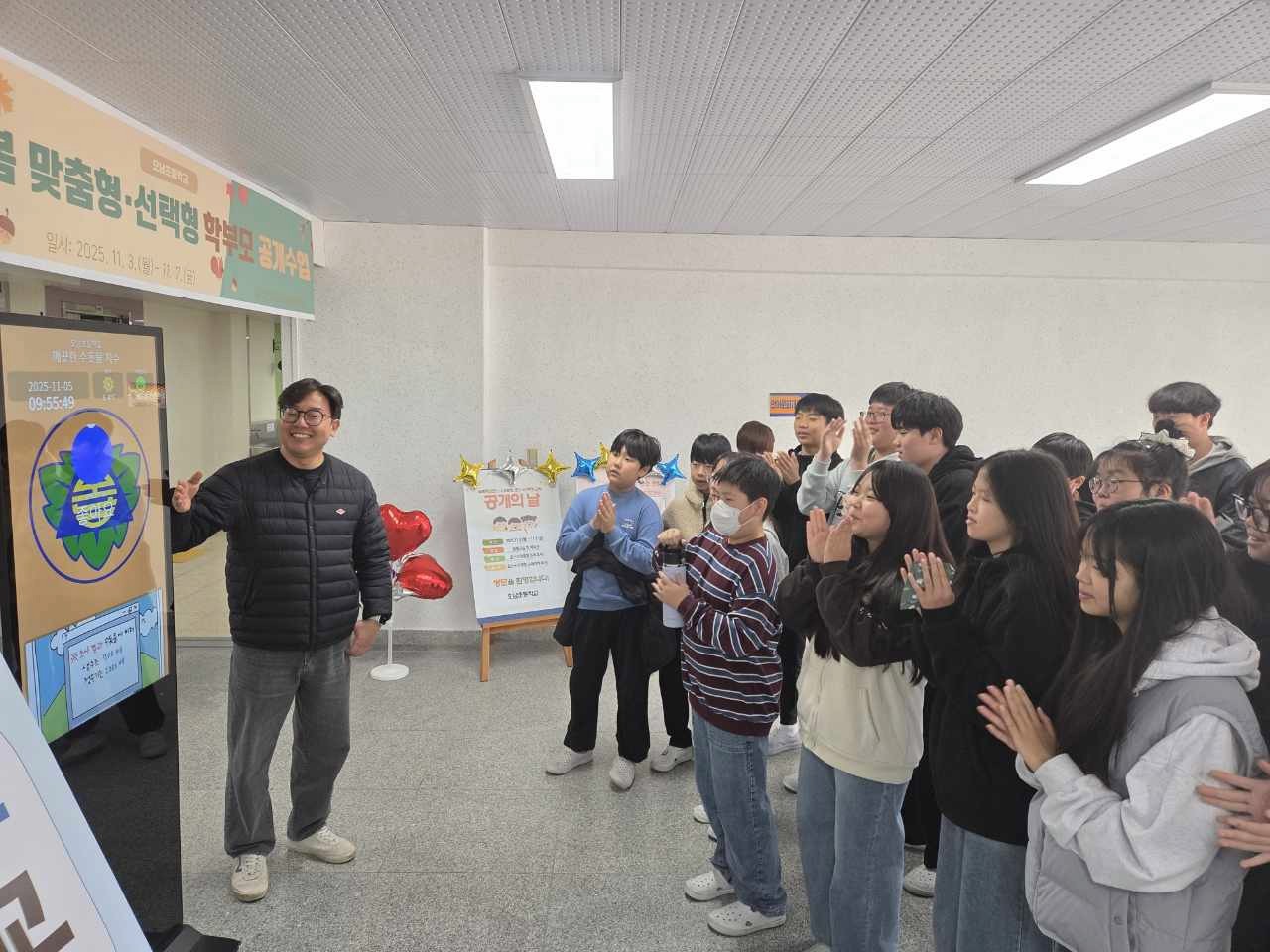 설치 완료 후, 오남초등학교 로비에 설치된 스탠딩 모니터 앞에는 많은 학생과 교직원들이 모였습니다. 직접 화면을 보며 우리 학교에 흐르는 물이 어떻게 관리되고 있는지 실시간 모니터링 수치를 설명하는 시간을 가졌습니다.