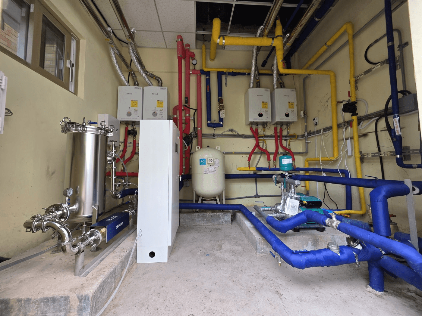 During construction, a persistent rooftop plant-room issue—standing water accumulation—was identified and resolved through additional floor finishing (re-leveling) work. Afterward, triple-layer epoxy waterproofing was applied, along with thermal insulation to prevent freeze damage, fundamentally improving the school’s infrastructure so the system can operate in optimal condition throughout all four seasons.