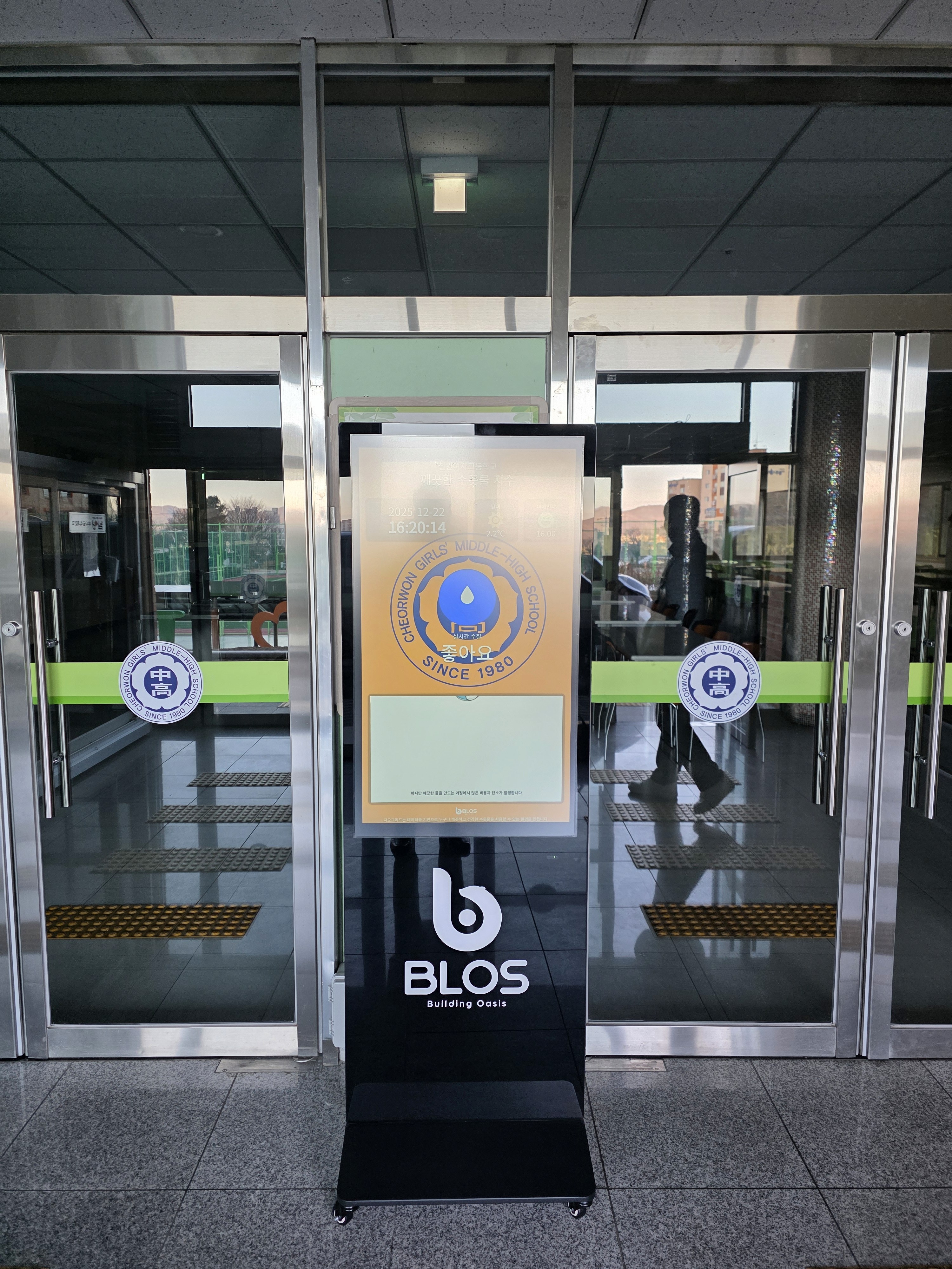 설치 완료 후, 세원고등학교 복도에 설치된 디지털 정보 키오스크(BLOS-Care 스크린)는 정수된 물의 상태를 학생들에게 실시간으로 투명하게 공개합니다.