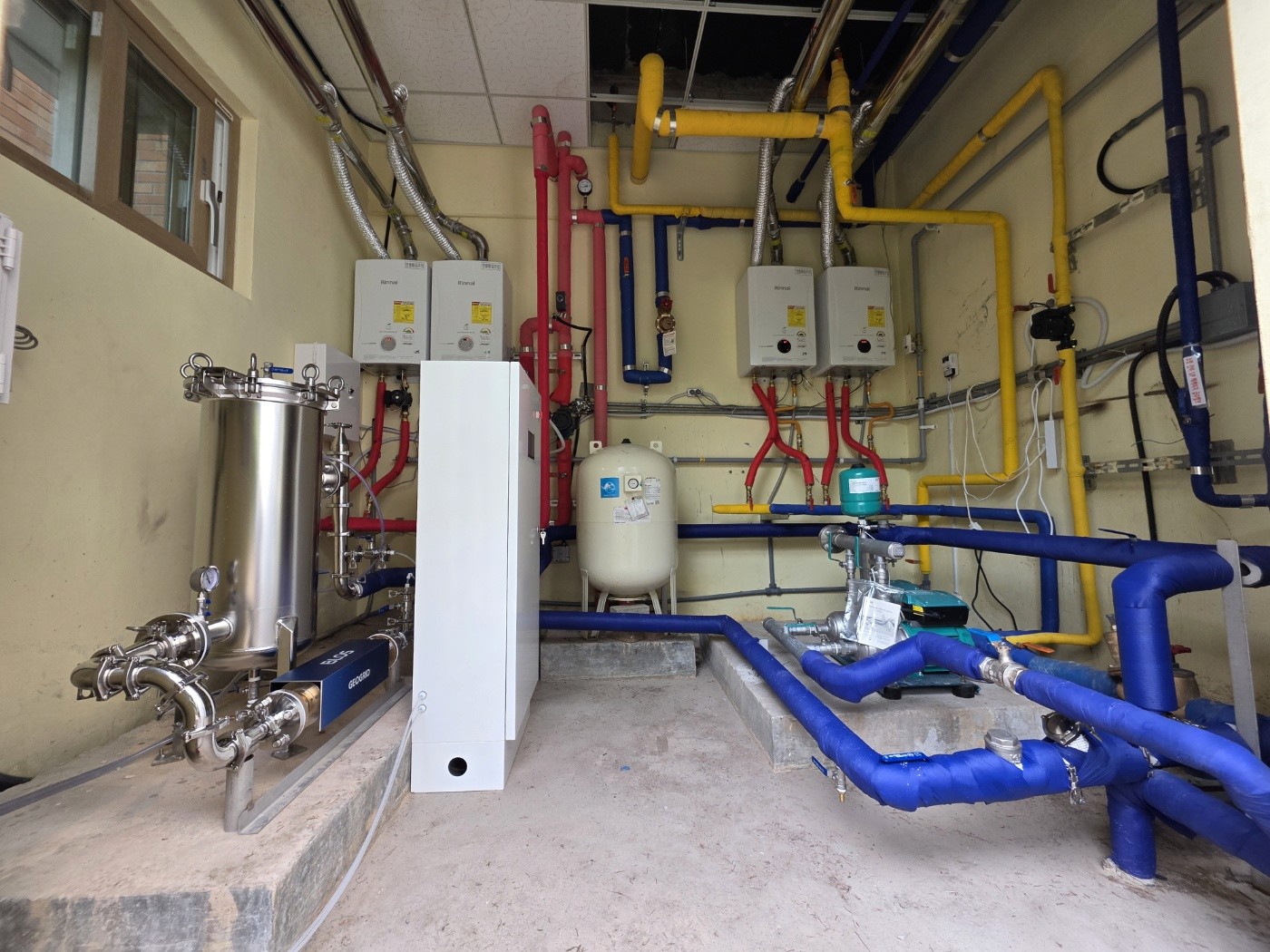 특히 공사 과정에서 발견된 옥상 플랜트실의 고질적인 물고임 현상을 해결하기 위해 바닥 미장 공사를 추가로 시행했습니다. 이후 3중 에폭시 방수 처리와 동파 방지를 위한 보온 작업을 병행하여 시스템이 사계절 내내 최적의 상태에서 가동될 수 있도록 학교 환경 자체를 근본적으로 개선했습니다.